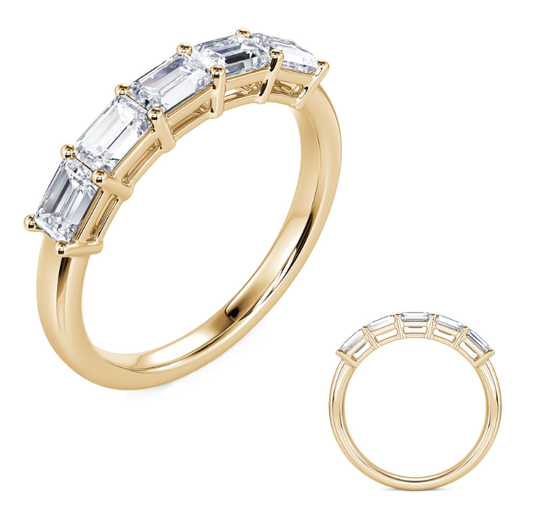 Radiating warmth and elegance, this 14K yellow gold band showcases five captivating emerald-cut diamonds, totaling 0.96 carats. The step-cut facets create a sophisticated, mirror-like sparkle, beautifully framed by a secure prong setting that enhances their brilliance. Ideal as a wedding band, anniversary ring, or a stunning stacking piece. Style # D4992YG