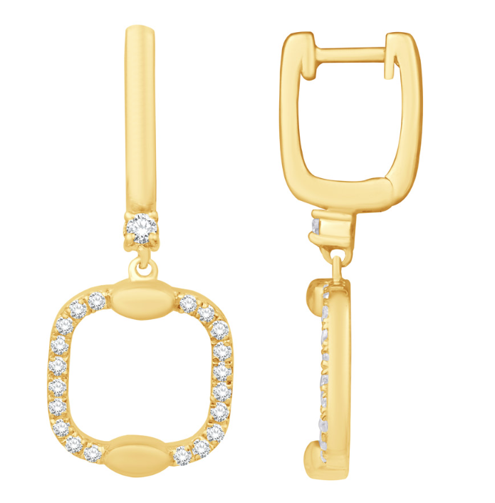 Modern elegance meets timeless sparkle in these 14K yellow gold cushion-outline drop earrings. Suspended from sleek hinged hoops, each earring showcases a softly squared open frame adorned with 21 round brilliant diamonds (42 total) in a micro prong setting, totaling 0.34 carats. Smooth gold accents at the frame’s corners add a contemporary touch, making these earrings perfect for both day-to-night wear. Style # E8228YG