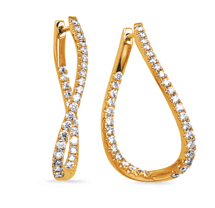 Crafted in 14K yellow gold, these stunning earrings feature a graceful twist design on one side and a teardrop-shaped hoop on the other, both encrusted with shimmering round diamonds. The prong setting maximizes light exposure, enhancing each stone’s brilliance for a radiant finish. Style # E8072YG