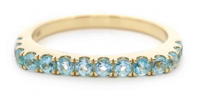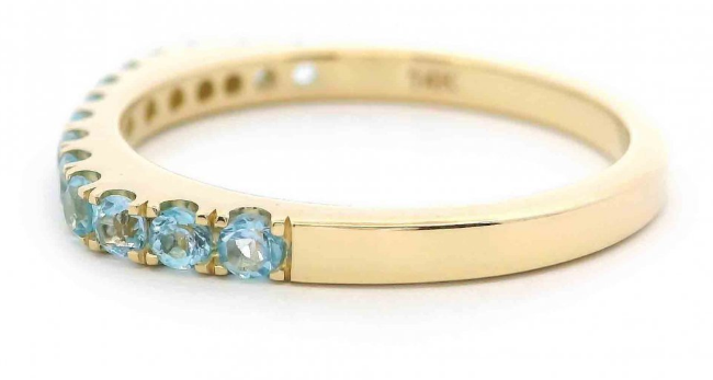 A sleek pop of color in a modern design. This 14K yellow gold ring features a straight bar illusion shank set with 14 sparkling gemstones. Choose from Swiss Blue Topaz, Peridot, Citrine, or Pale Amethyst for a vibrant accent that stacks beautifully or shines on its own.