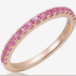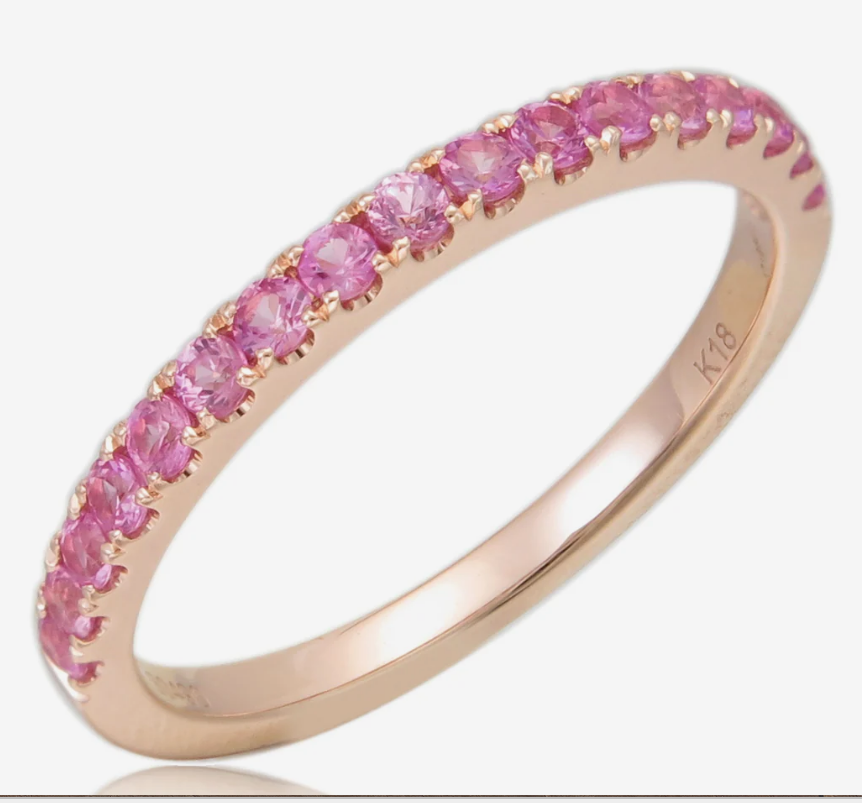 Vibrant and feminine, this stackable band is set with brilliant pink sapphires in a sleek 18K gold band. Perfect for stacking with other rings or wearing solo for a pop of color, it adds a touch of modern elegance to any jewelry collection.