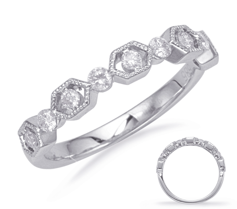 This band is available in 14K White Gold. There are a total of 9 stones. There are round diamonds with a total carat weight of 0.29ct set in a Prong Set setting. Style # EN8134-BWG