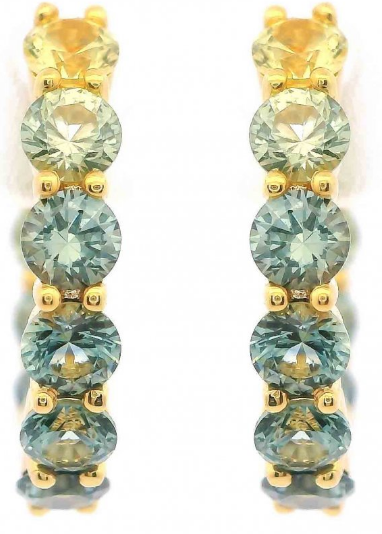 Color meets elegance in these stunning 14K yellow gold inside-out huggie hoops. Featuring 1.58ct of ombre sapphires in your choice of rainbow multi-color, ombre pink, ombre green, or ombre yellow, these 14mm diameter hoops bring a bold yet wearable pop of sparkle to any look.