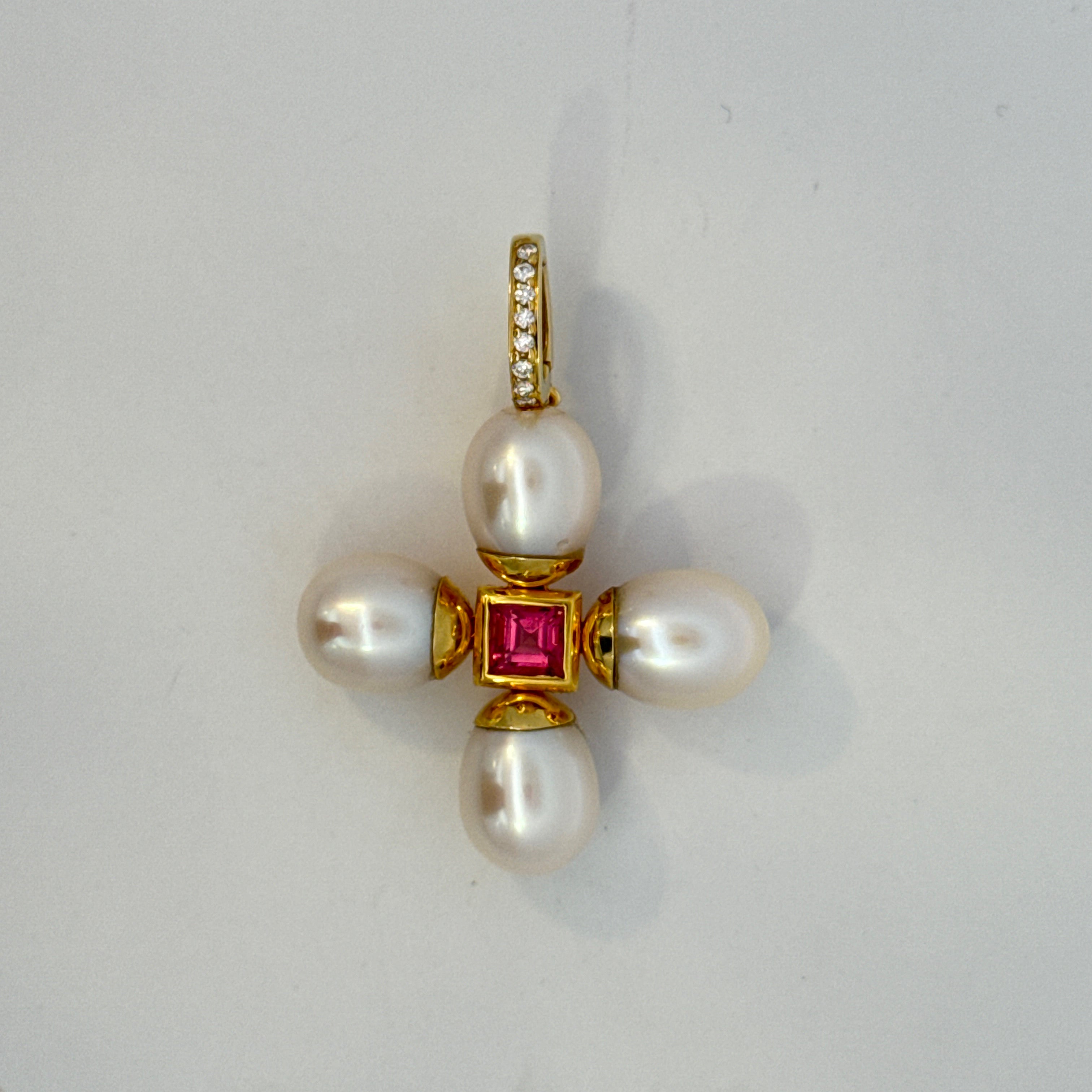 14K Yellow Gold Pearl & Pink Tourmaline Cross Enhancer