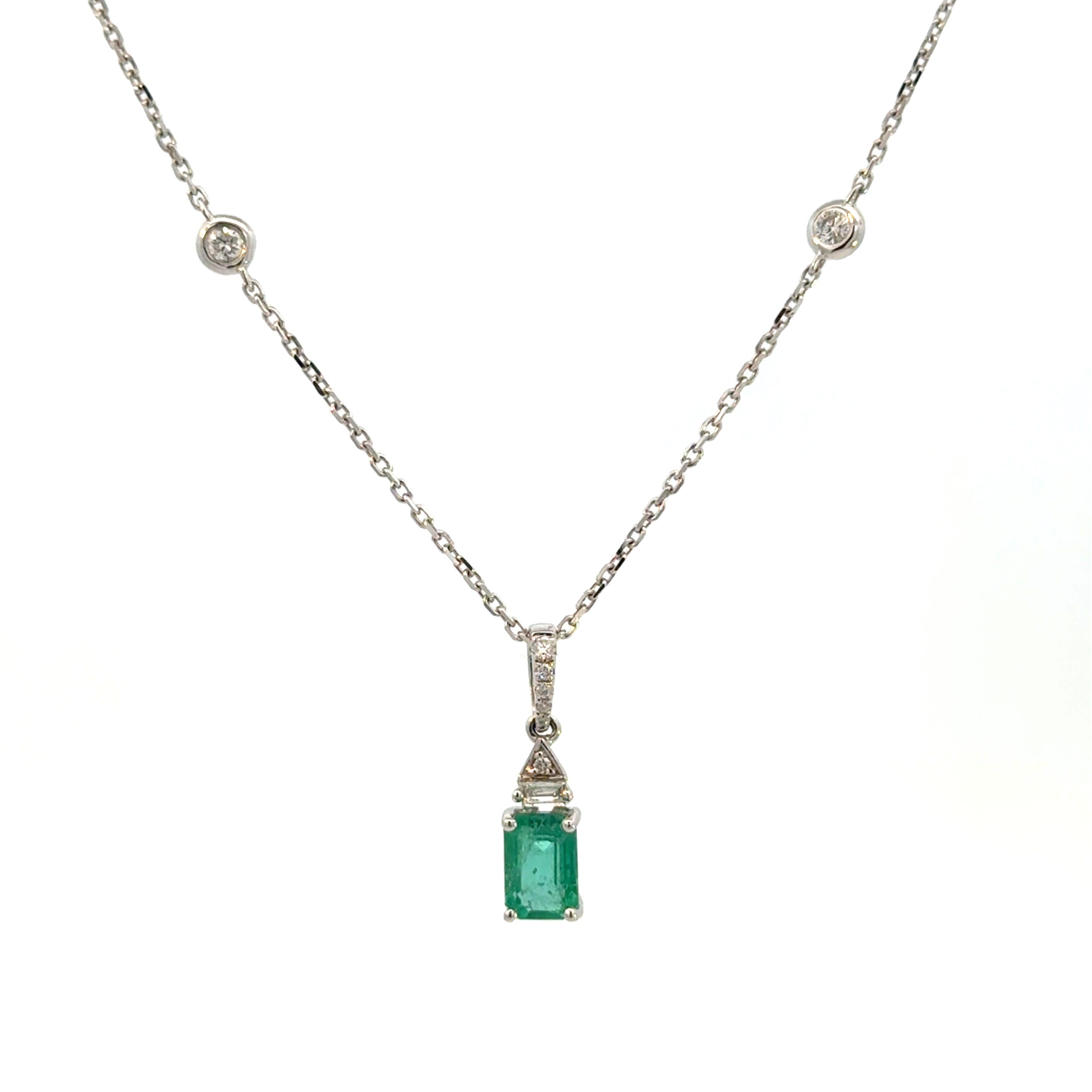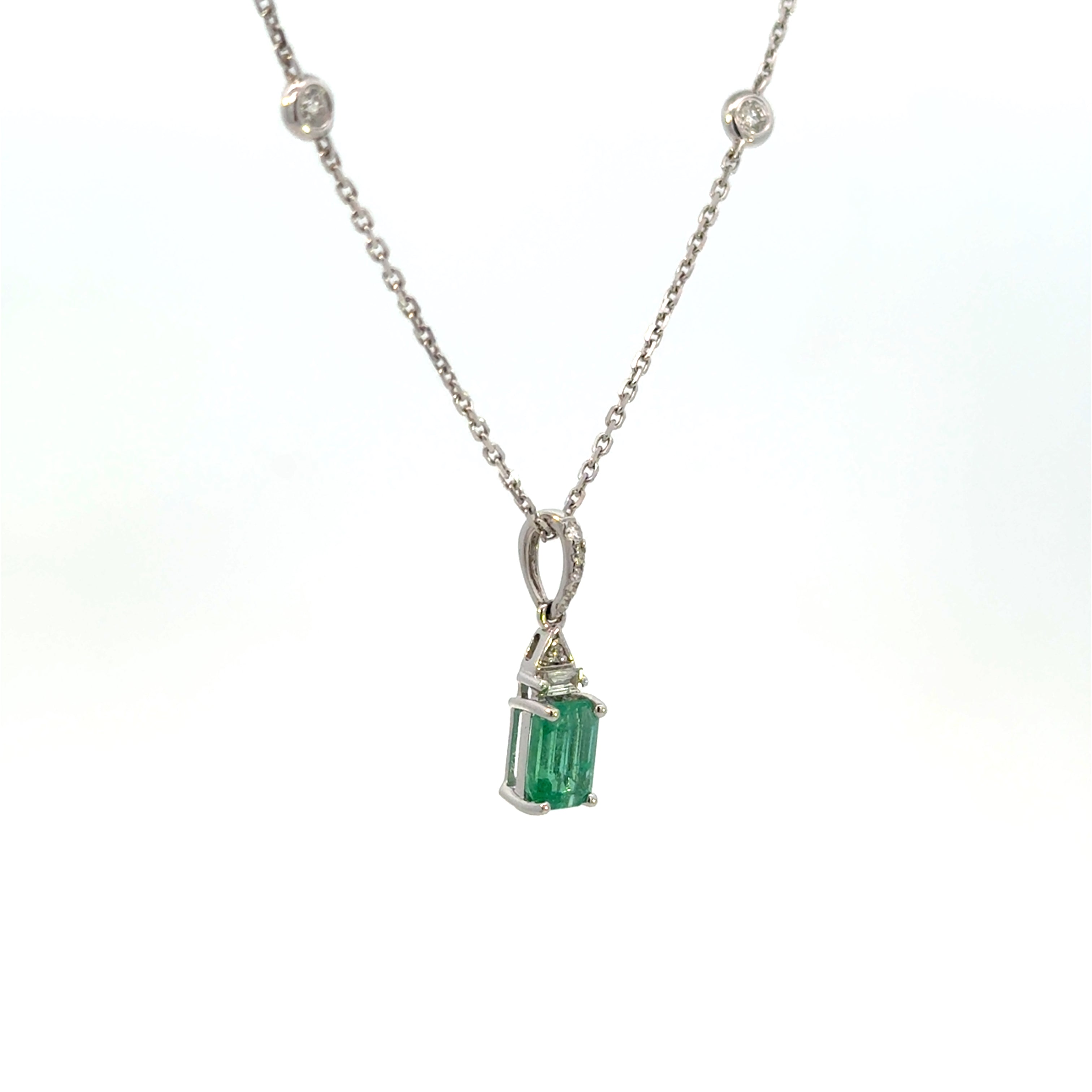 14K White Gold Emerald & Diamond Baguette Pendant Necklace