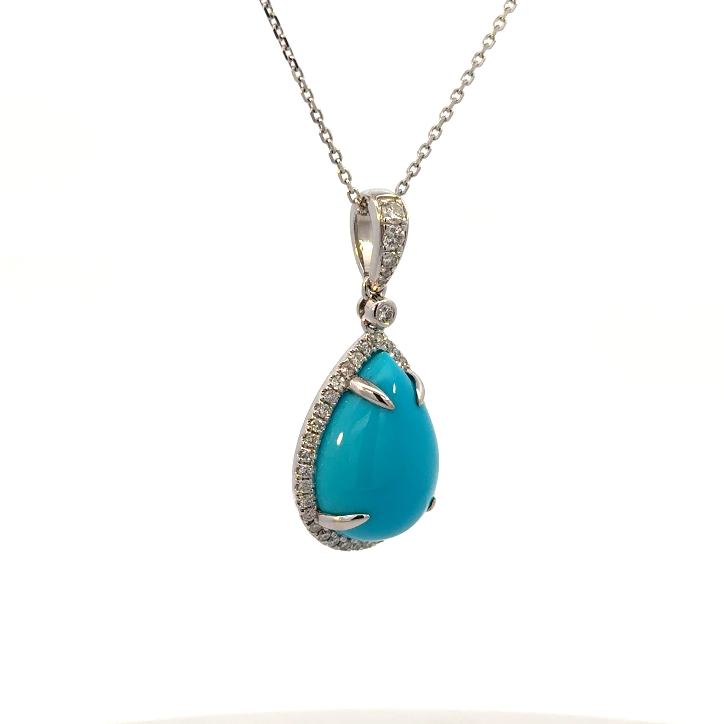 Vivid turquoise radiates against brilliant diamonds in this striking pendant. Crafted in 14K white gold, the teardrop cabochon is framed by a halo of round diamonds with additional accents along the bail, blending bold color with refined sparkle.