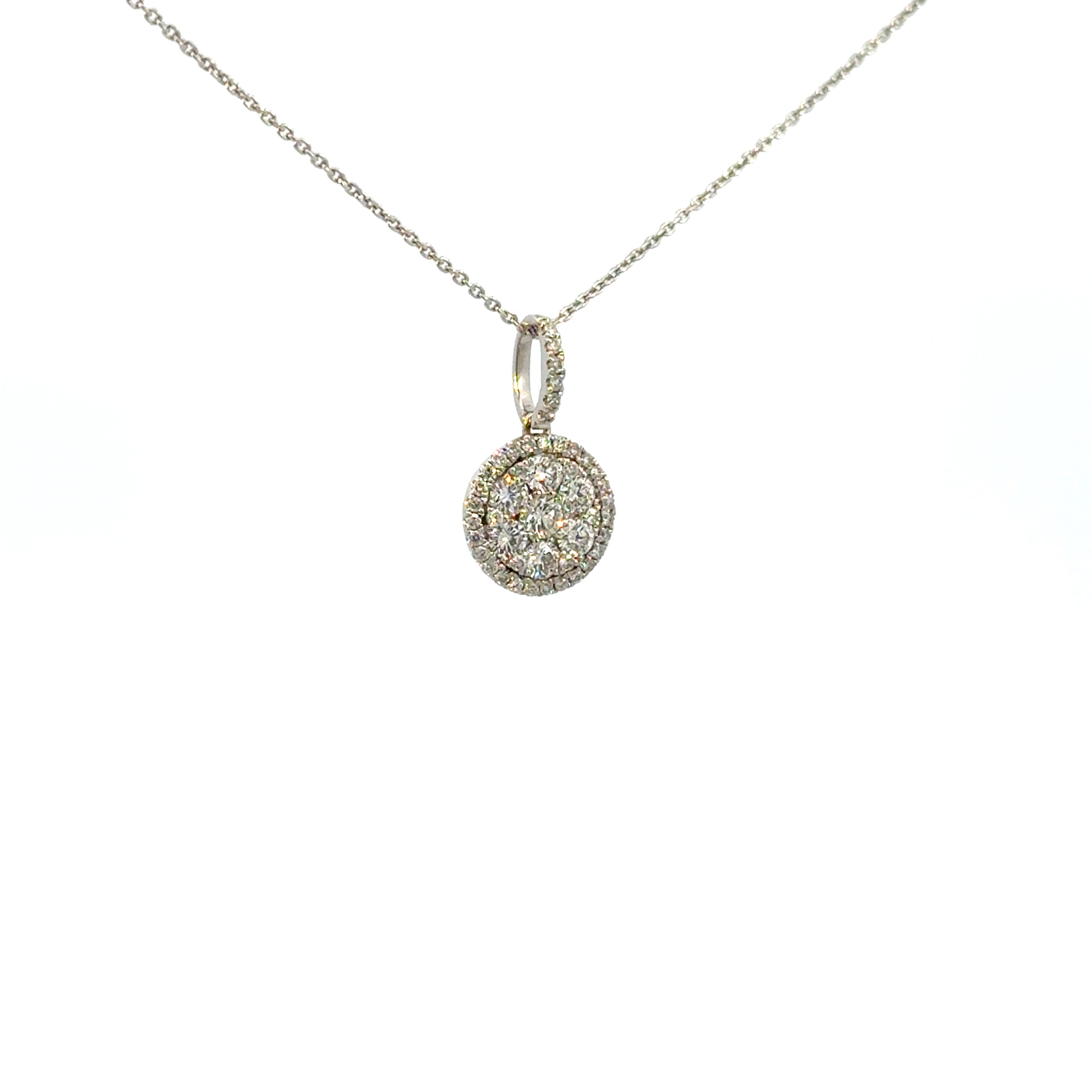• A timeless circle of light—this pendant features a dazzling halo of diamonds framing a cluster center, suspended from a delicate chain. Perfect for layering or wearing solo for maximum sparkle.