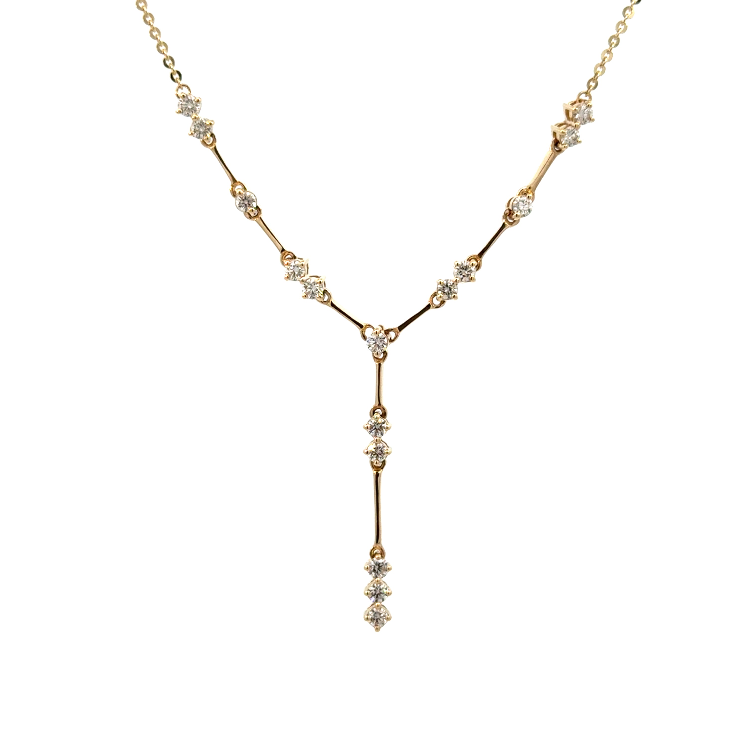 Sleek and refined, this 14K yellow gold Y-shape necklace is elegantly set with 0.65 carats of round brilliant diamonds. Designed to elongate the neckline with graceful sparkle, this piece blends modern sophistication with timeless allure. Perfect for layering or wearing as a statement of understated luxury. (Chain included.)
