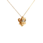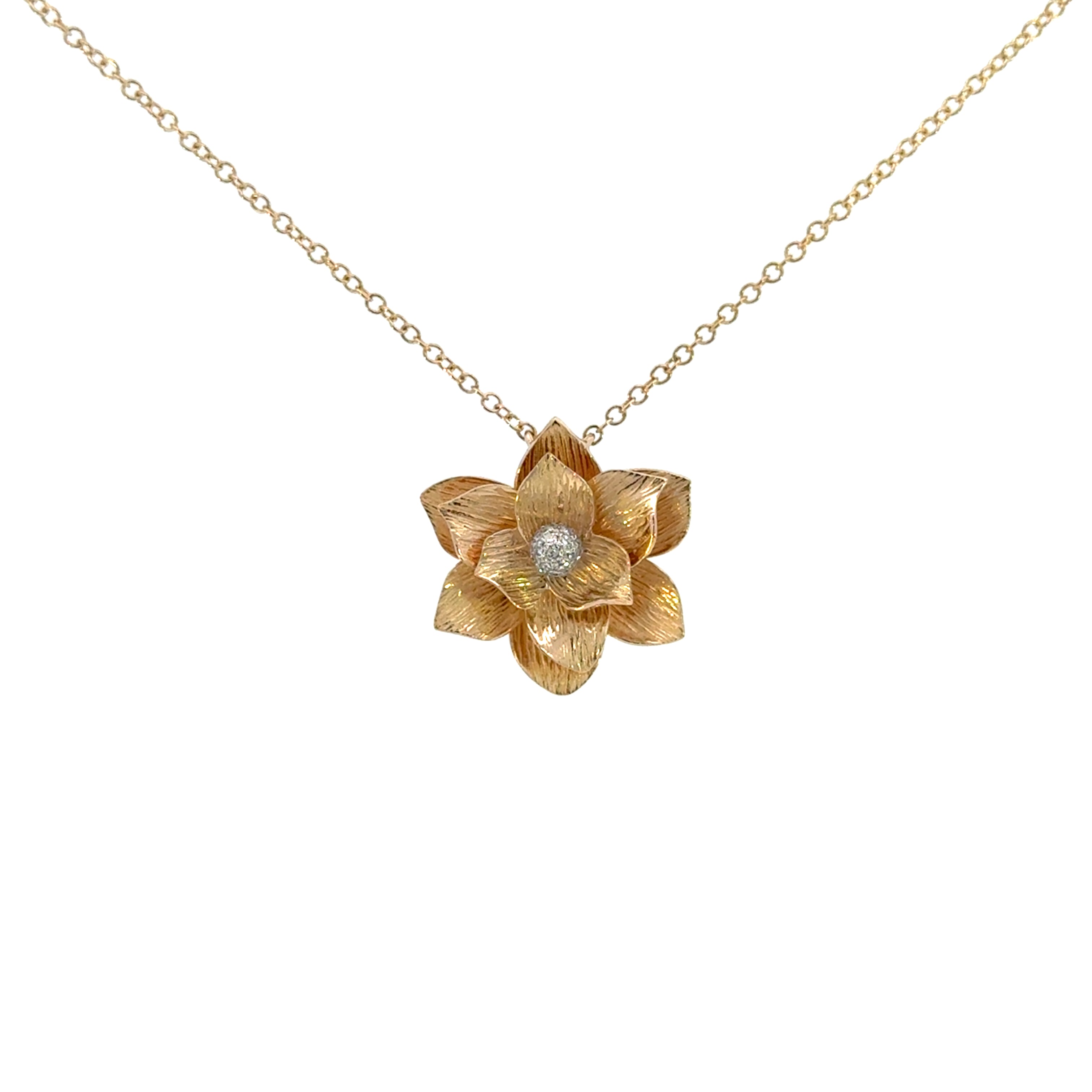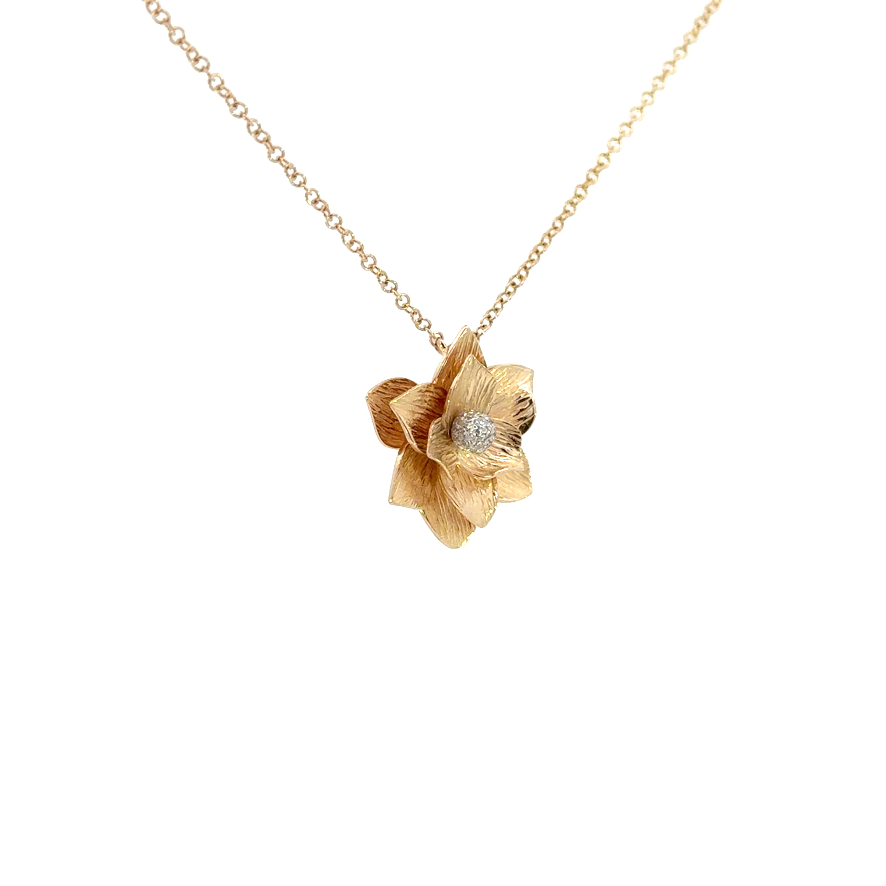 A blooming beauty crafted in 14K yellow gold. This sculptural pendant features a layered petal design with a diamond-set center, offering both organic texture and sparkle.