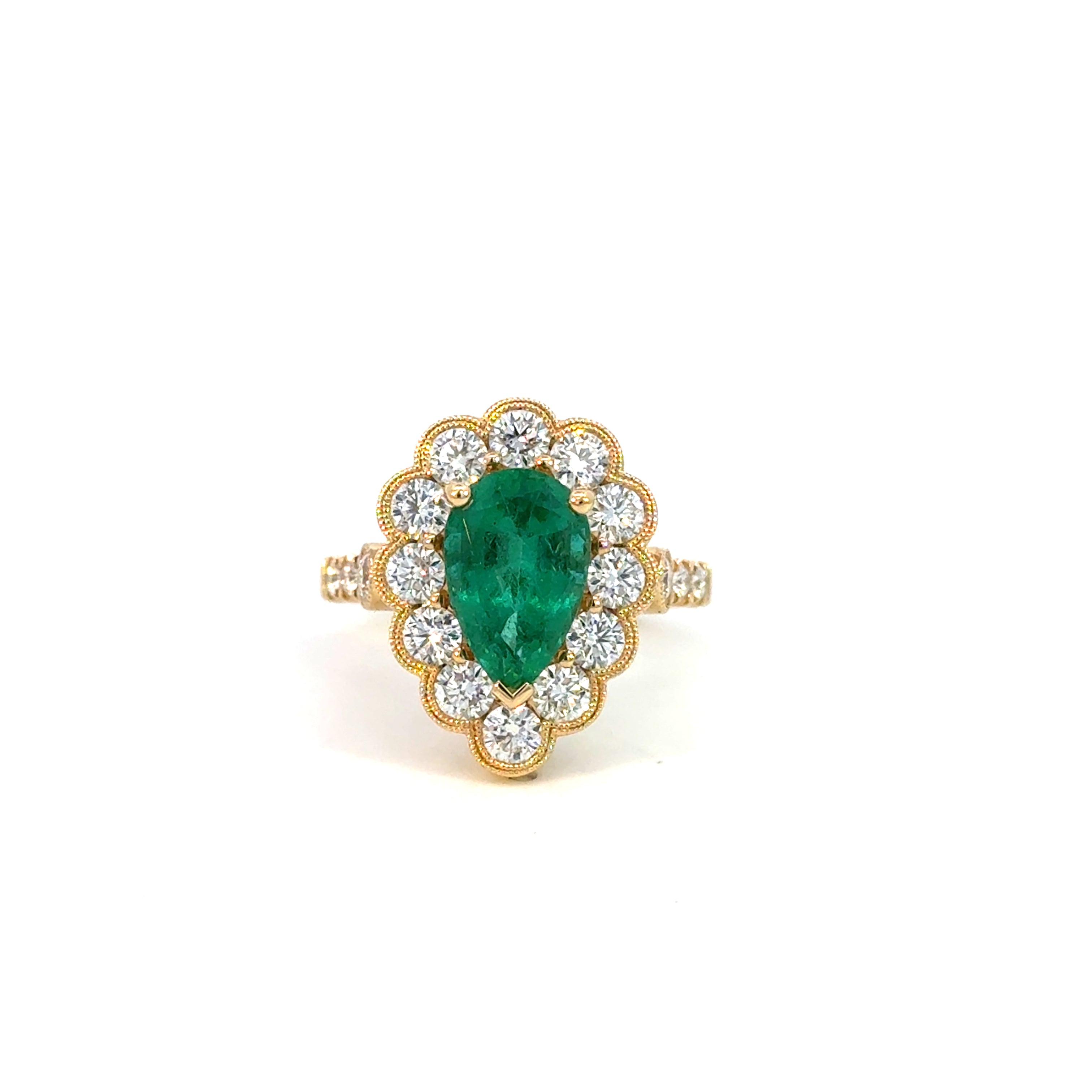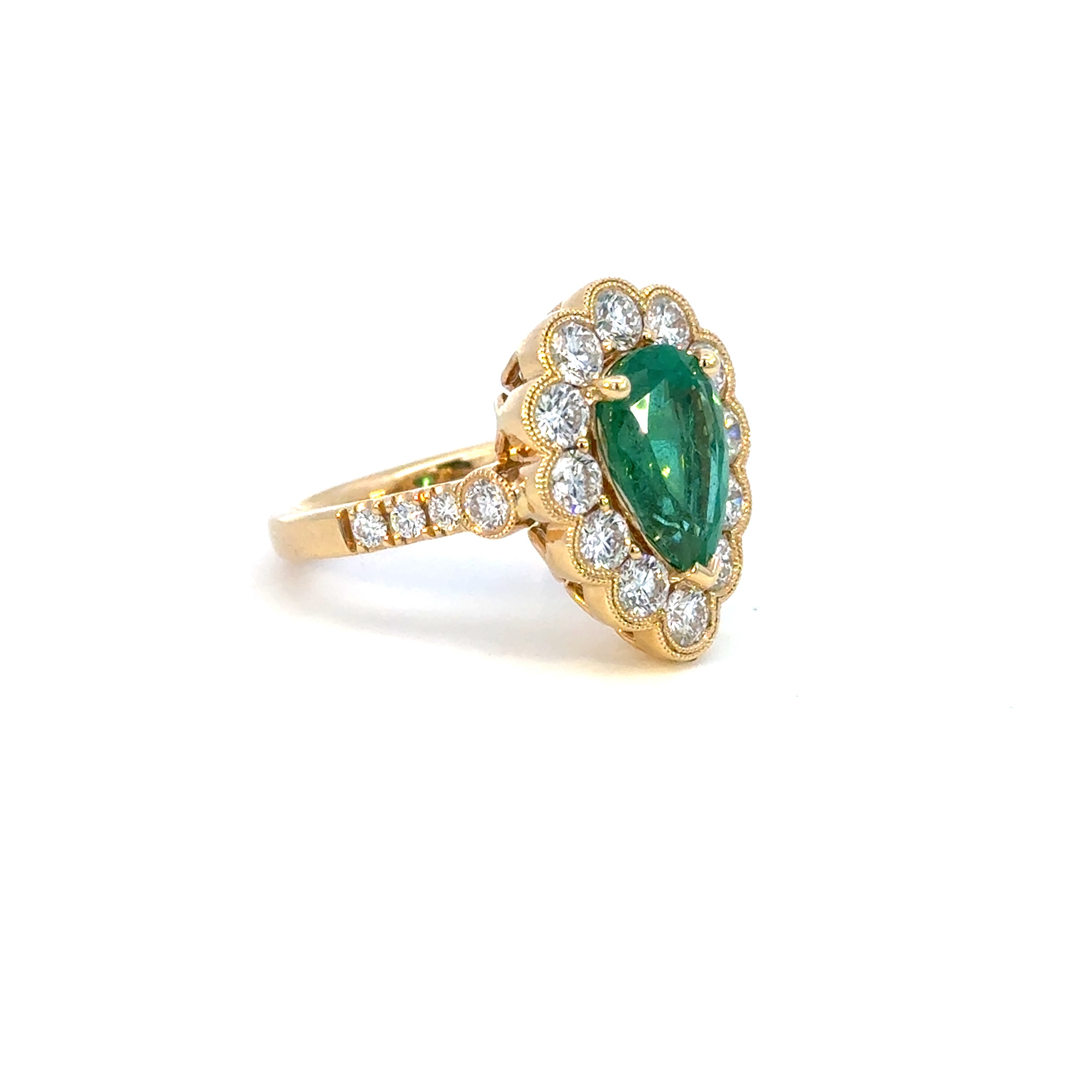14k Yellow Gold Pear Emerald & Diamond Halo Ring