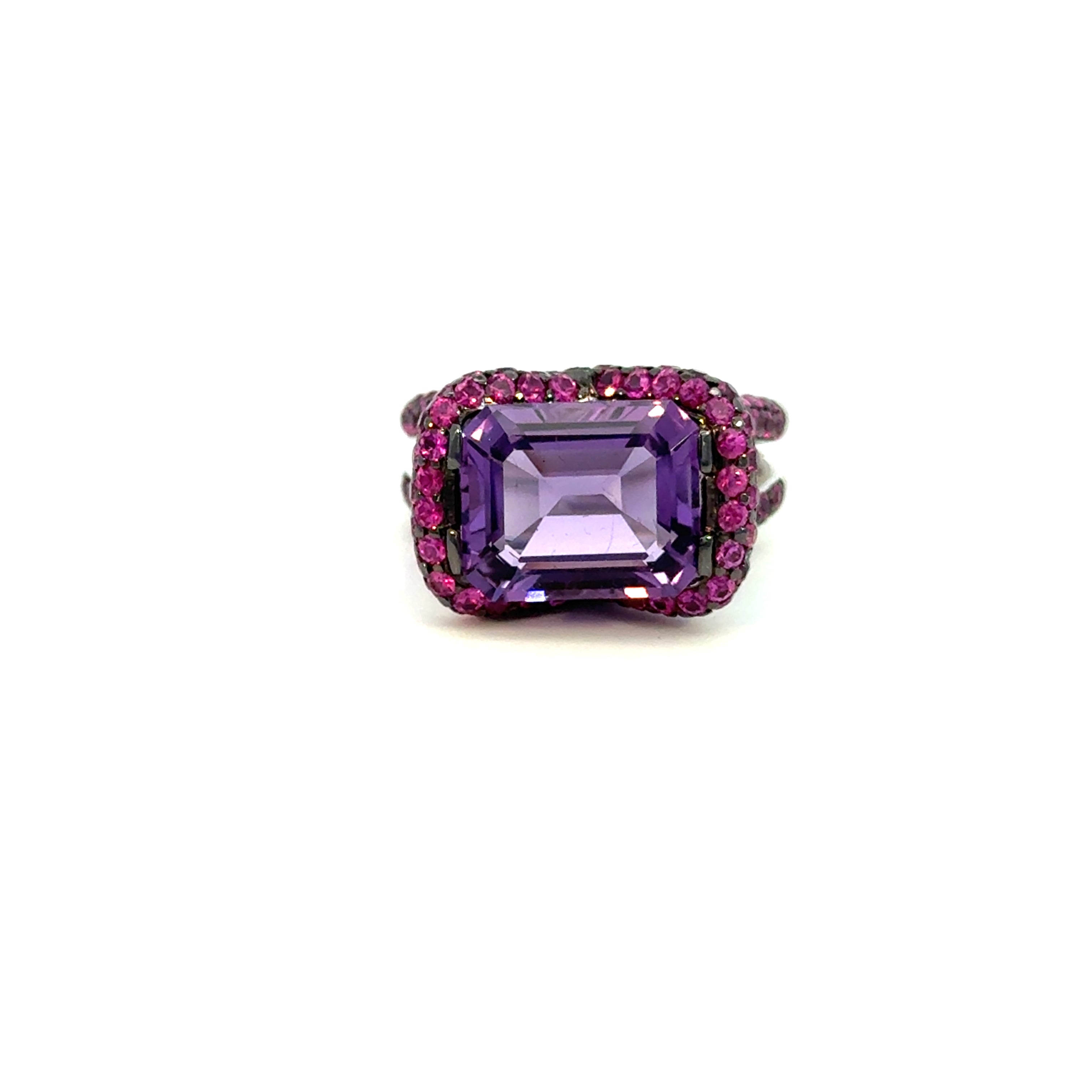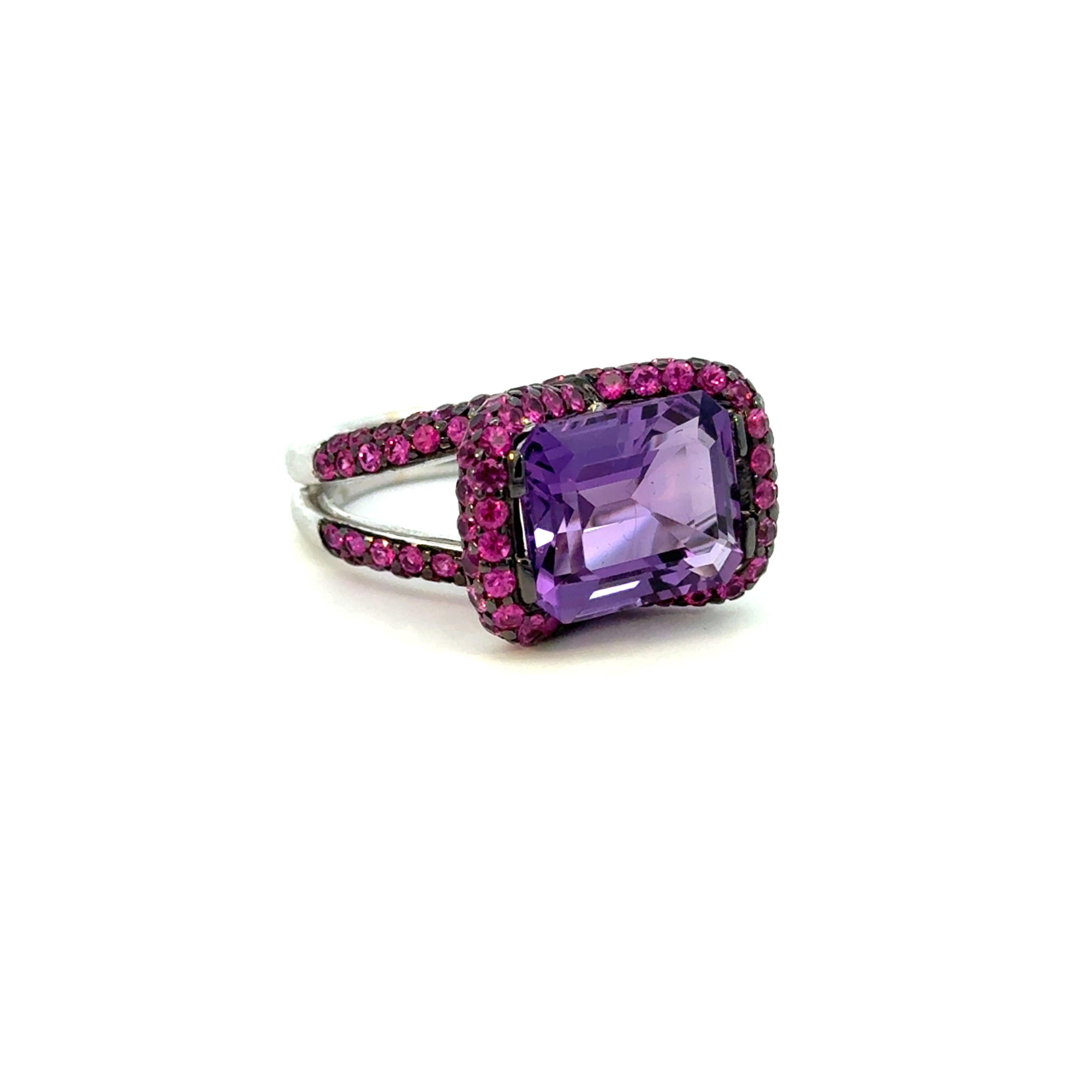 14K White Gold Amethyst & Pink Sapphire Halo Ring