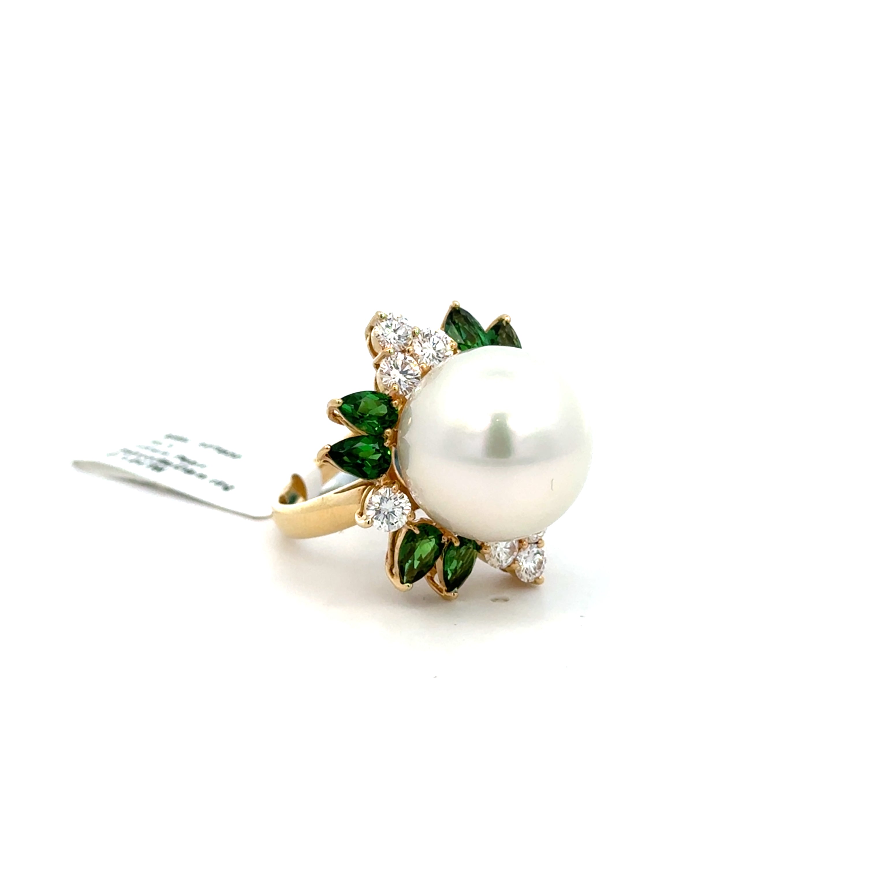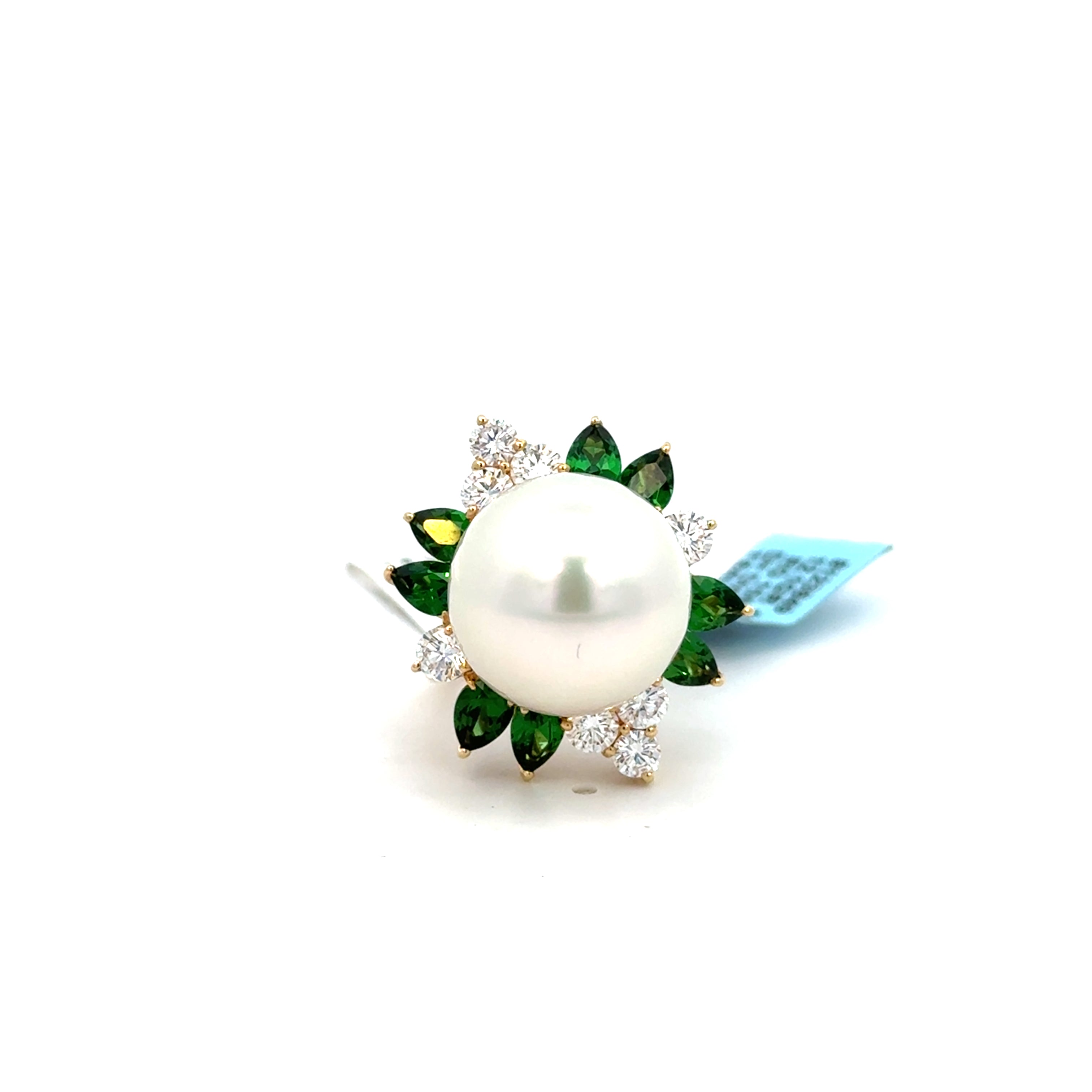 14K Yellow Gold Pearl, Emerald & Diamond Cocktail Ring