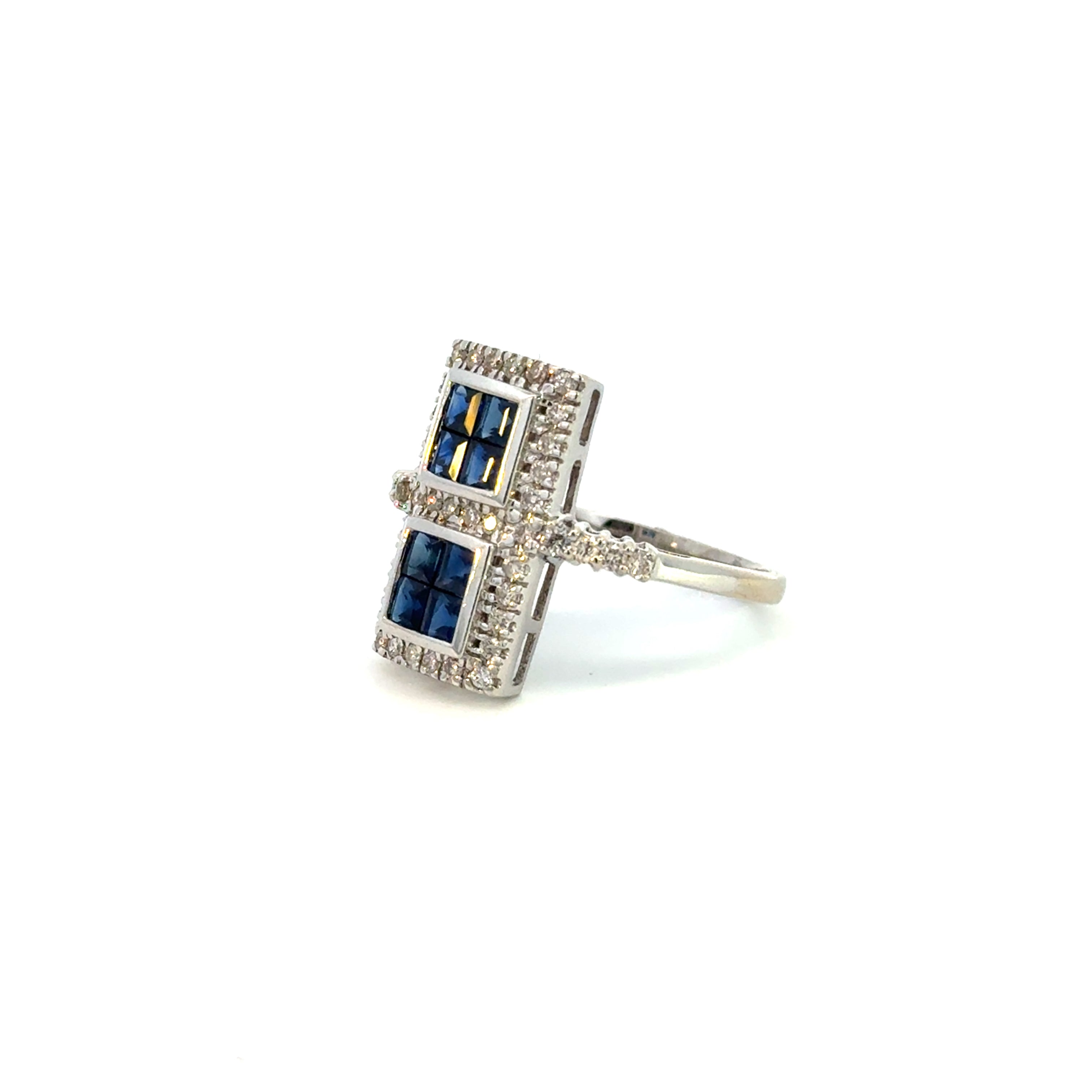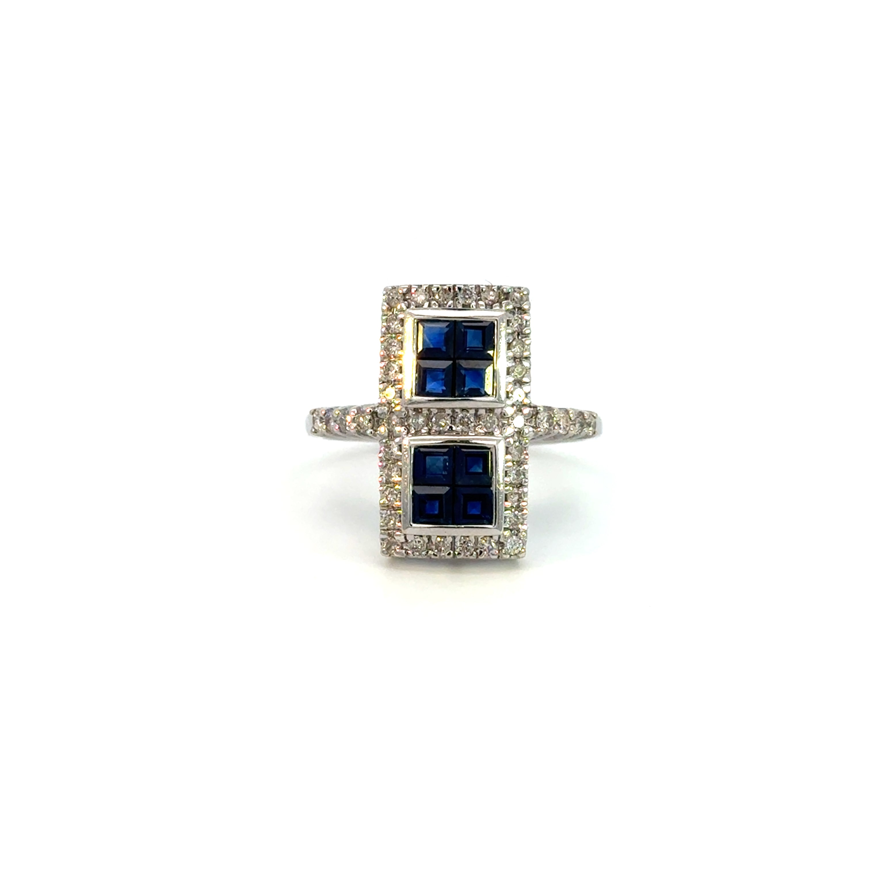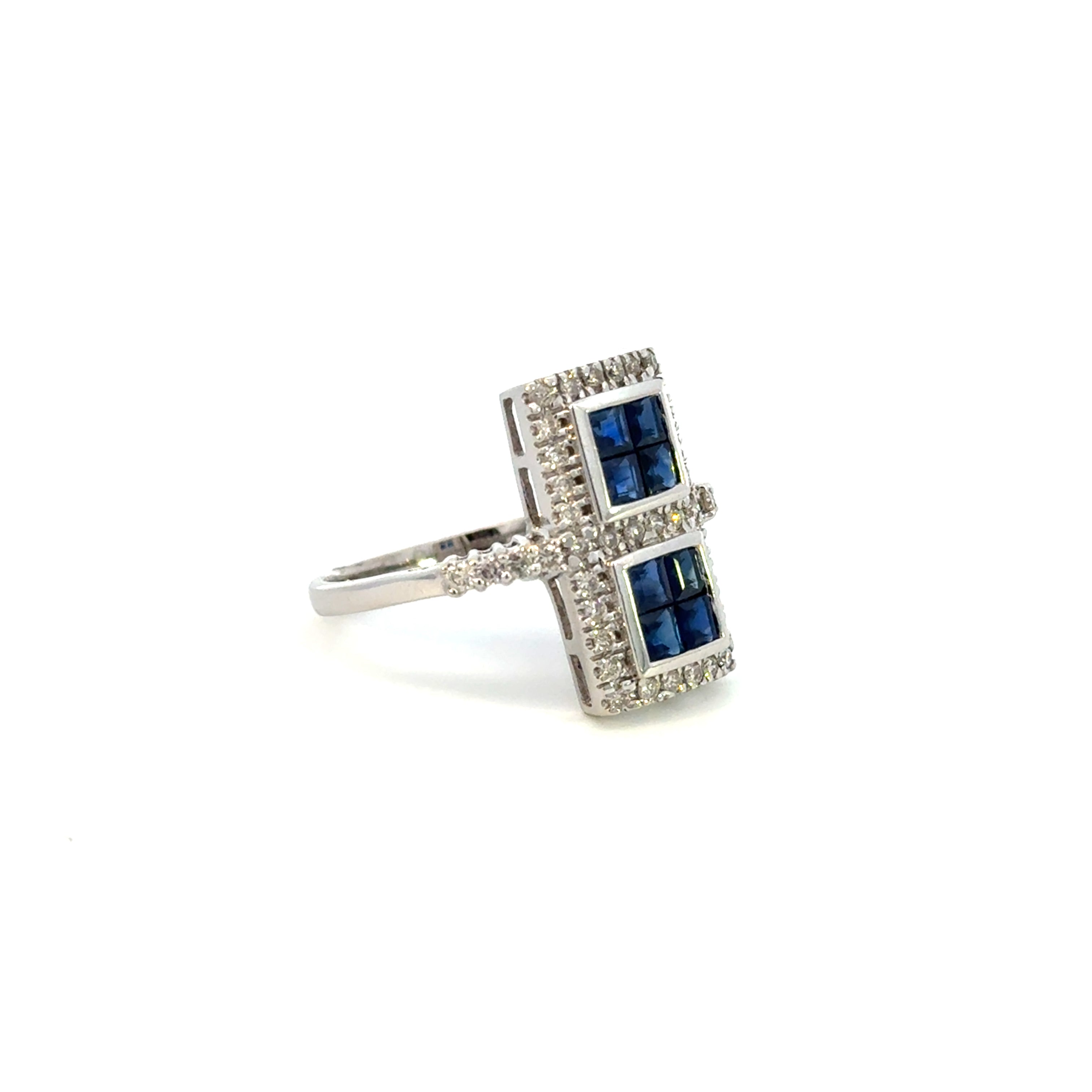 Bold and distinctive, this statement ring features two square sapphire clusters, each framed by a halo of shimmering round diamonds. Crafted in luminous 14K white gold, the rich blue sapphires create striking contrast against the brilliant diamond accents and polished metal.