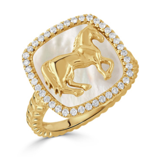 From the Equestrian Collection, this elegant 18K yellow gold ring features a detailed rearing horse set against a luminous 2.76 ct white mother-of-pearl backdrop. The design is framed by 40 sparkling diamonds totaling 0.27 carats, combining equestrian charm with refined luxury. Style R10764WMP