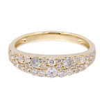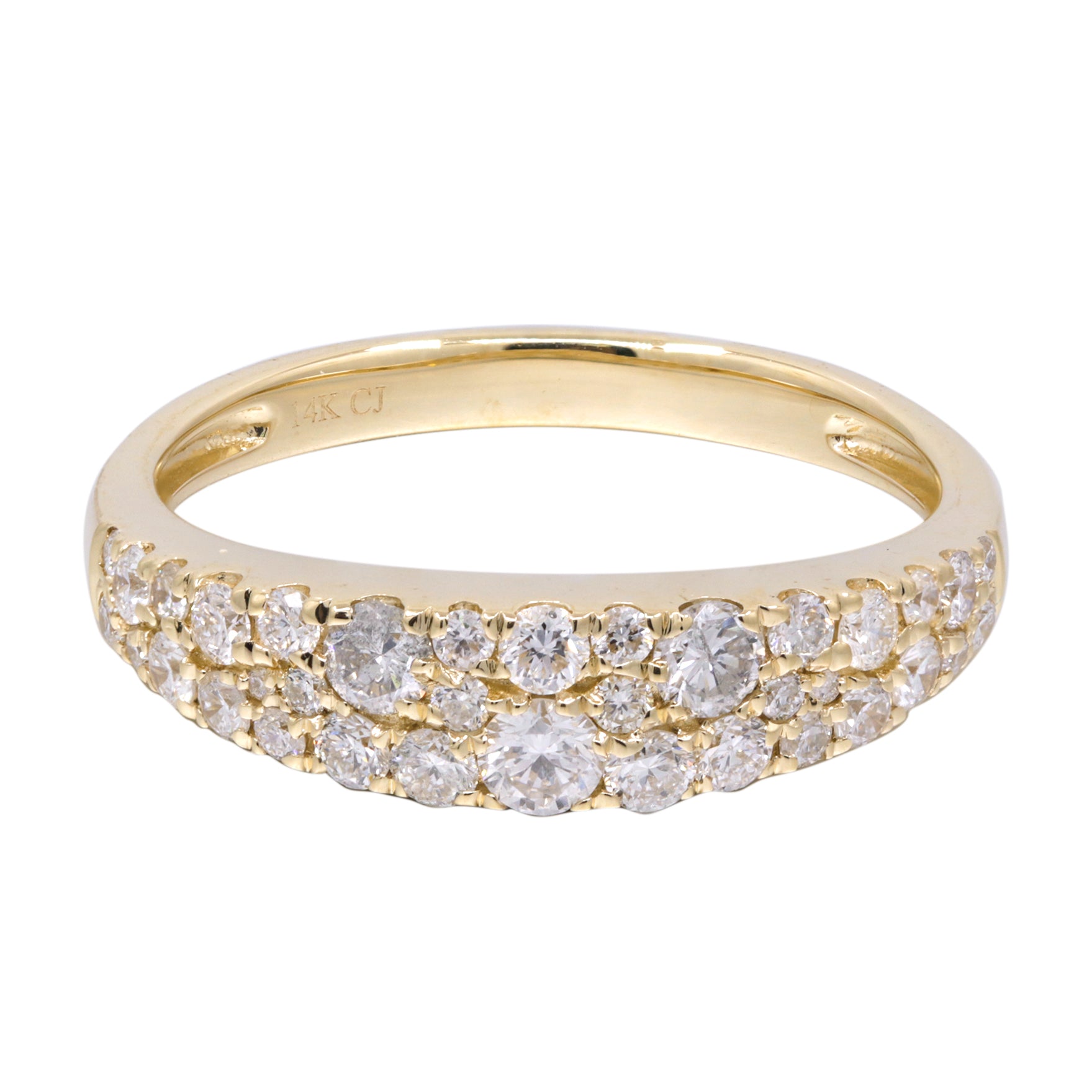 Three rows of round diamonds shimmer across this bold yet refined design. The 14K yellow gold band offers warmth and luxury, perfect as a statement ring or anniversary piece.
