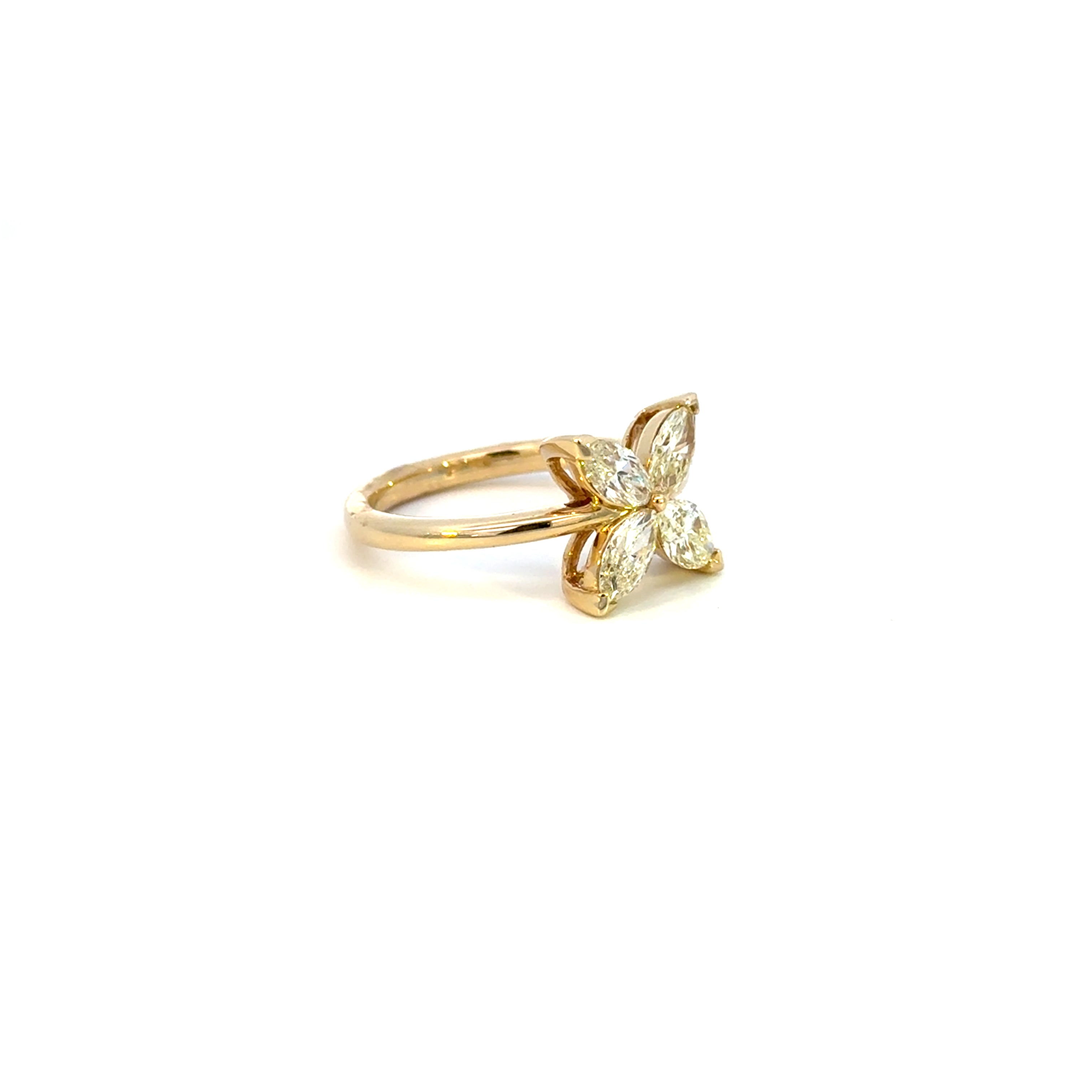 Shaped like a blooming flower, this ring features five marquise-cut diamonds that radiate brilliance. A bold yet feminine design, perfect as a statement piece or special gift.