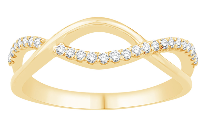 Sleek and sophisticated, this fashion ring features an elegant twist design crafted in 14K yellow gold. A delicate row of 25 round diamonds (totaling 0.20ct) is set in a micro prong setting, adding sparkle to every curve. Perfect as a standalone statement or stacked for a layered look, this piece blends modern minimalism with timeless beauty. Style # D4924YG