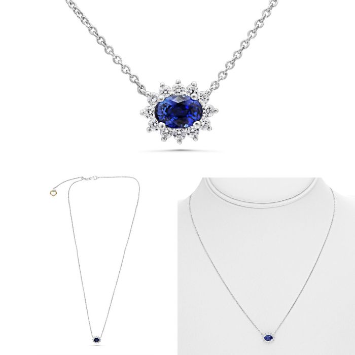 18K White Gold Oval Sapphire & Diamond Halo Necklace