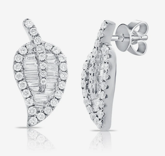 14K White Gold Diamond Baguette Leaf Stud Earrings