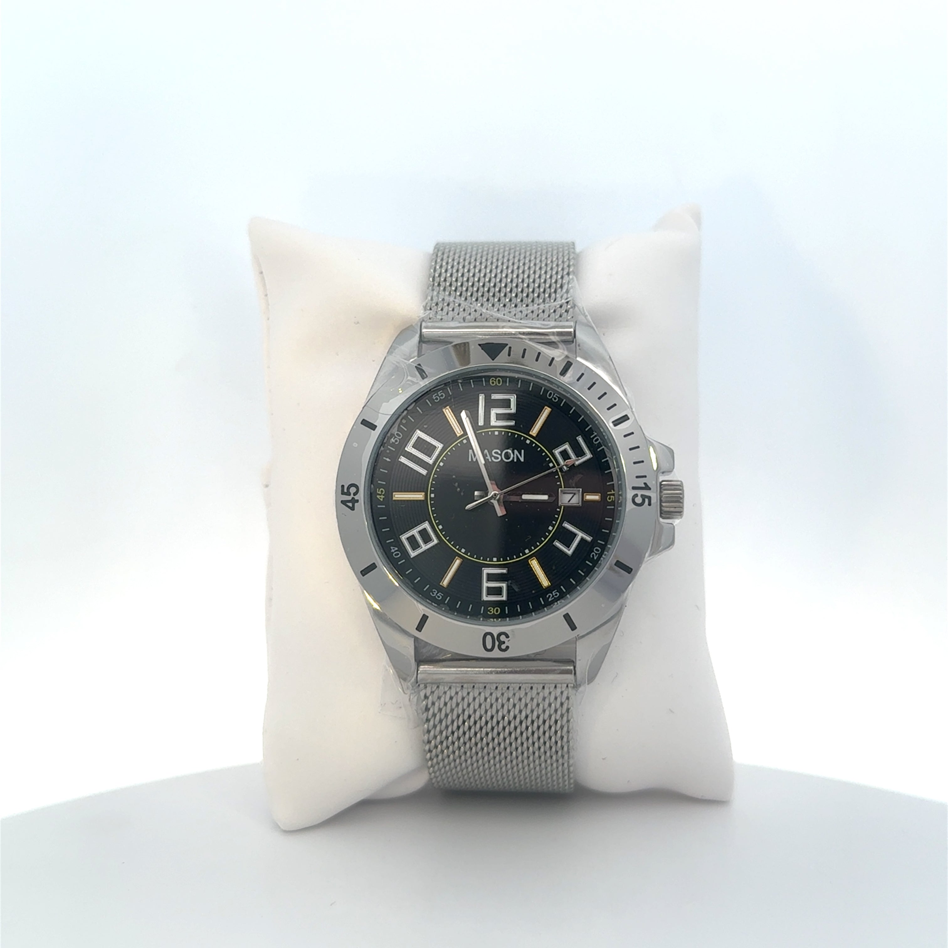 Sophisticated and bold, this Mason watch features a striking black dial accented with gold-tone markers. The stainless steel mesh bracelet adds a modern edge while maintaining comfort and durability.