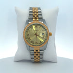 Classic and versatile, this Mason watch combines silver and gold tones with a rich gold sunburst dial. Roman numerals and a fluted bezel create a polished look that transitions effortlessly from day to night.
