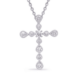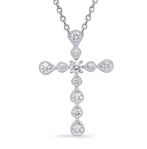 Graceful and radiant, this diamond cross pendant in 14K white gold is a timeless expression of faith and elegance. Featuring 11 round brilliant-cut diamonds with a total carat weight of 0.63ct, each stone is set in delicate micro prong settings that enhance the sparkle while maintaining a refined silhouette. Teardrop-shaped bezels with milgrain detailing add vintage charm and texture to this meaningful piece. Style # P3338WG