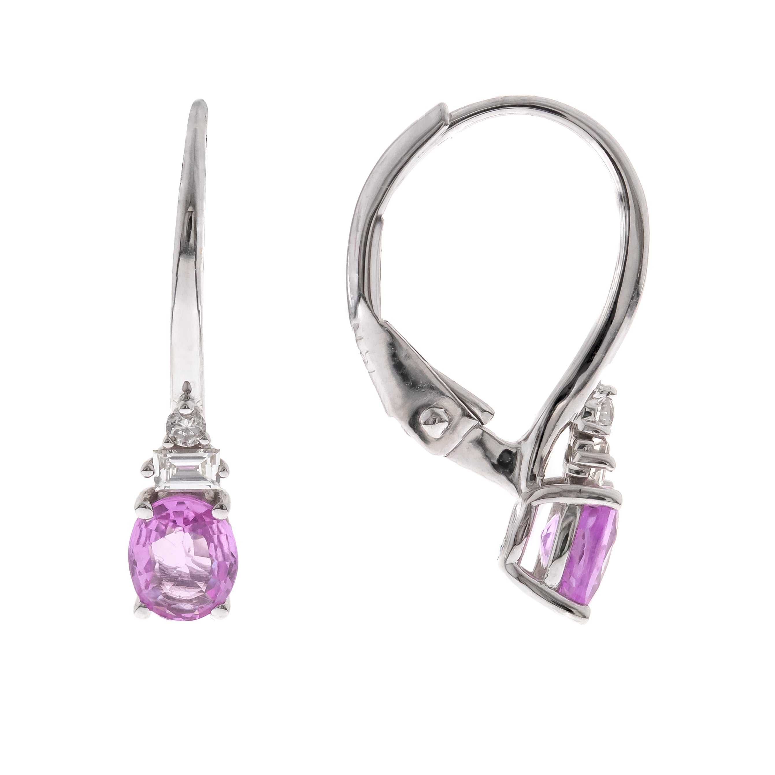 Playful color meets refined luxury in these oval pink sapphire drops accented by baguette and round diamonds. Their lever-back design adds comfort and movement to these elegant earrings.