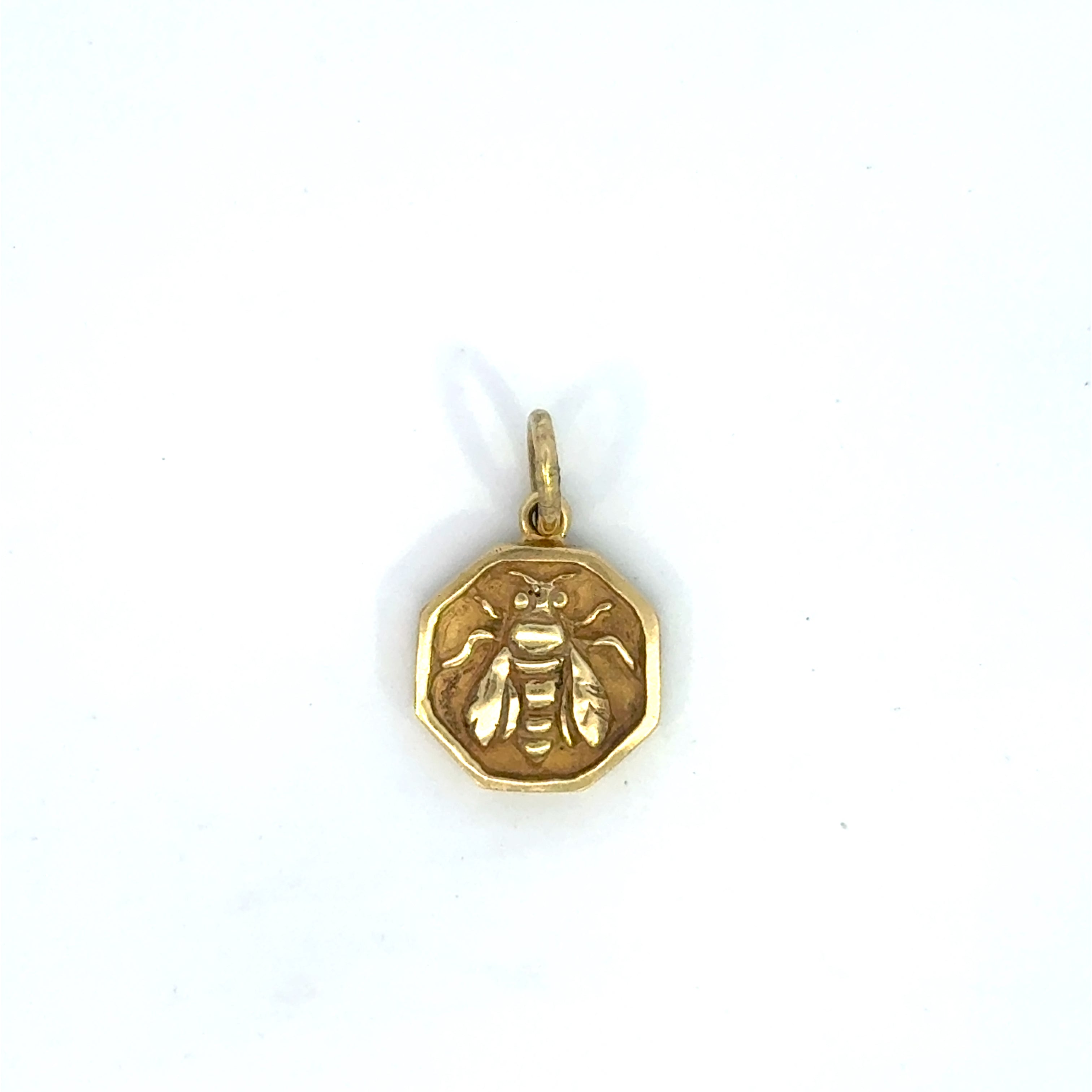 A charming 14K yellow gold pendant featuring a detailed bee motif. Its octagonal frame adds a touch of vintage character, perfect for layering with other charms.