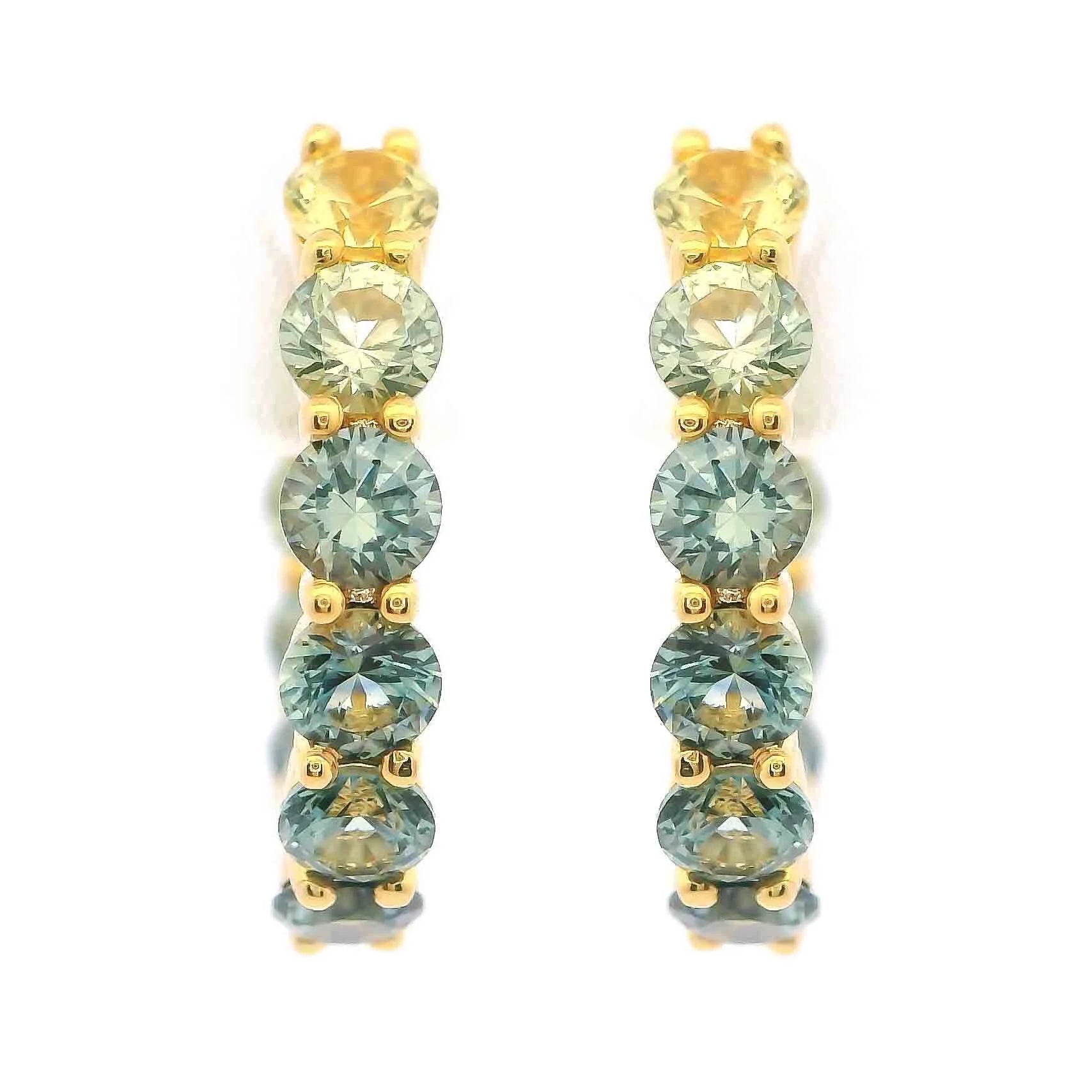 Bold yet refined, these inside-out huggie hoops showcase an ombre of green sapphires that shimmer with every movement. Crafted in 14K yellow gold with a 14mm diameter, they bring vibrant color and modern elegance to your everyday jewelry rotation.