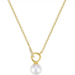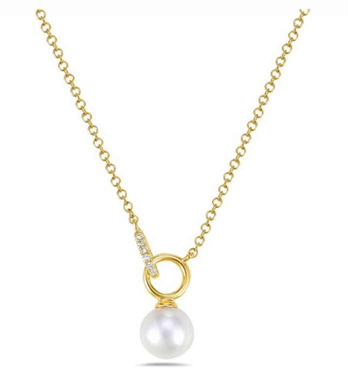 Timeless elegance meets modern detail. This stunning necklace features a luminous freshwater pearl suspended from a polished 14K yellow gold loop accented with .02ct of sparkling round diamonds. A classic piece with a contemporary twist – perfect for weddings, anniversaries, or everyday sophistication.