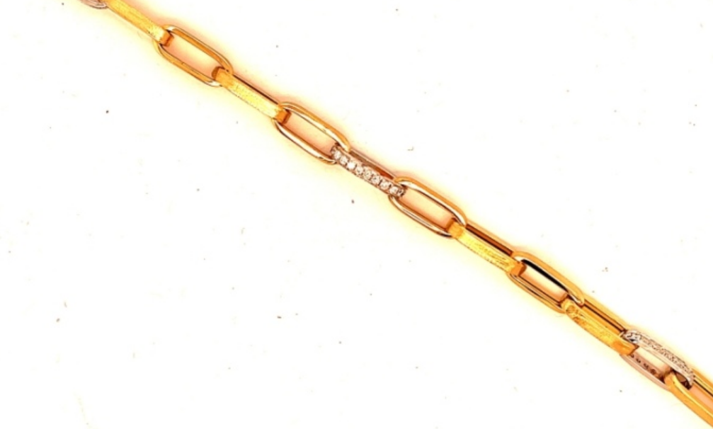Sleek and contemporary, this two-tone bracelet features elongated oval links in polished 18K yellow and white gold, accented by brilliant-cut diamonds totaling 0.64 carats. The diamond-accented link adds a refined sparkle, making this piece a perfect blend of modern style and timeless elegance. HB203100