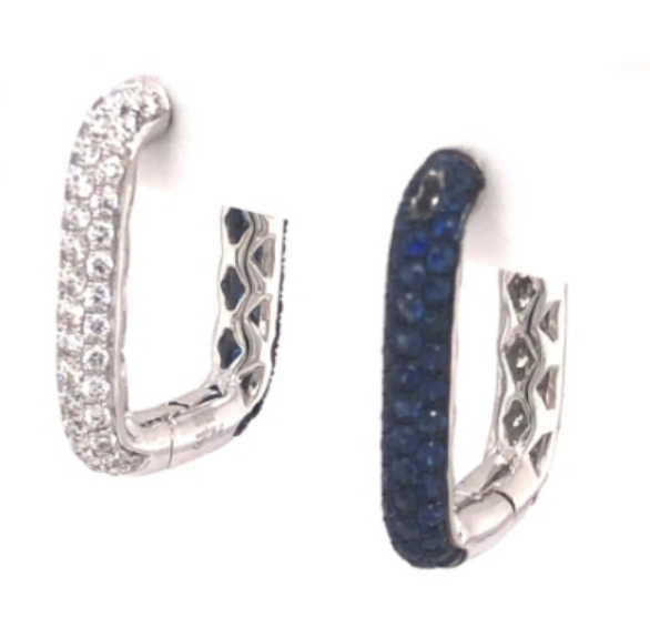 Beautifully designed in lustrous 18K white gold, these versatile earrings feature a striking dual-sided design—one side adorned with round brilliant-cut diamonds totaling approximately 0.76 carats, and the other with rich blue sapphires totaling approximately 0.97 carats. The stones are meticulously pavé-set to maximize sparkle and color, allowing the earrings to be worn with either side facing forward for a fresh, stylish look.