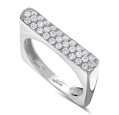This modern, geometric ring is crafted in polished 18K white gold, featuring a sleek rectangular bar design adorned with 24 pavé-set round brilliant-cut diamonds totaling 0.37 carats. Its contemporary silhouette offers a bold yet refined style, perfect for making a chic statement. HR12558