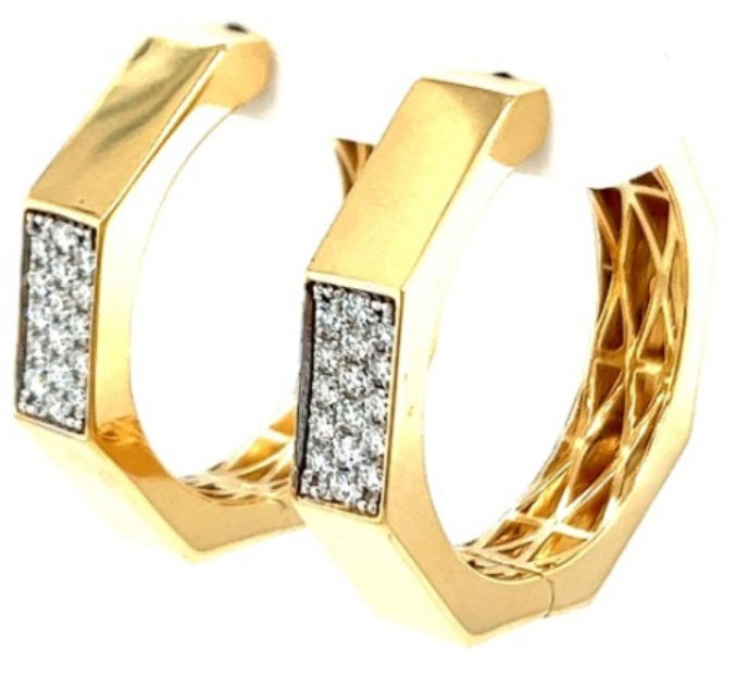 Modern hexagonal hoop earrings in 18K two-tone gold, each accented with a panel of 20 round brilliant-cut diamonds totaling 0.56 carats, combining bold geometry with refined sparkle. HE086