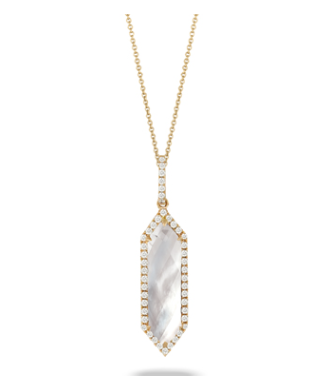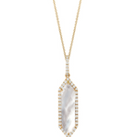 An elegant elongated hexagonal pendant featuring a luminous white mother of pearl base overlaid with clear quartz, framed by a sparkling halo of diamonds. Style: P8130WMP